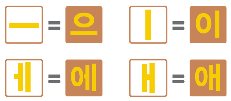 Write one side with ㅡ, ㅣ, ㅔ, ㅐ and the other with 으, 이, 에, 애. Compare them and notice that the sounds are the same.